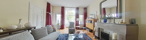 Op de hoek een chique voorzij-kamer met 3 hoge ramen en glas-in-lood bovenlichten, superlicht en mooi weids uitzicht. Deze kamer is bereikbaar vanuit de hal maar er is ook een deur naar de woonkamer toe.