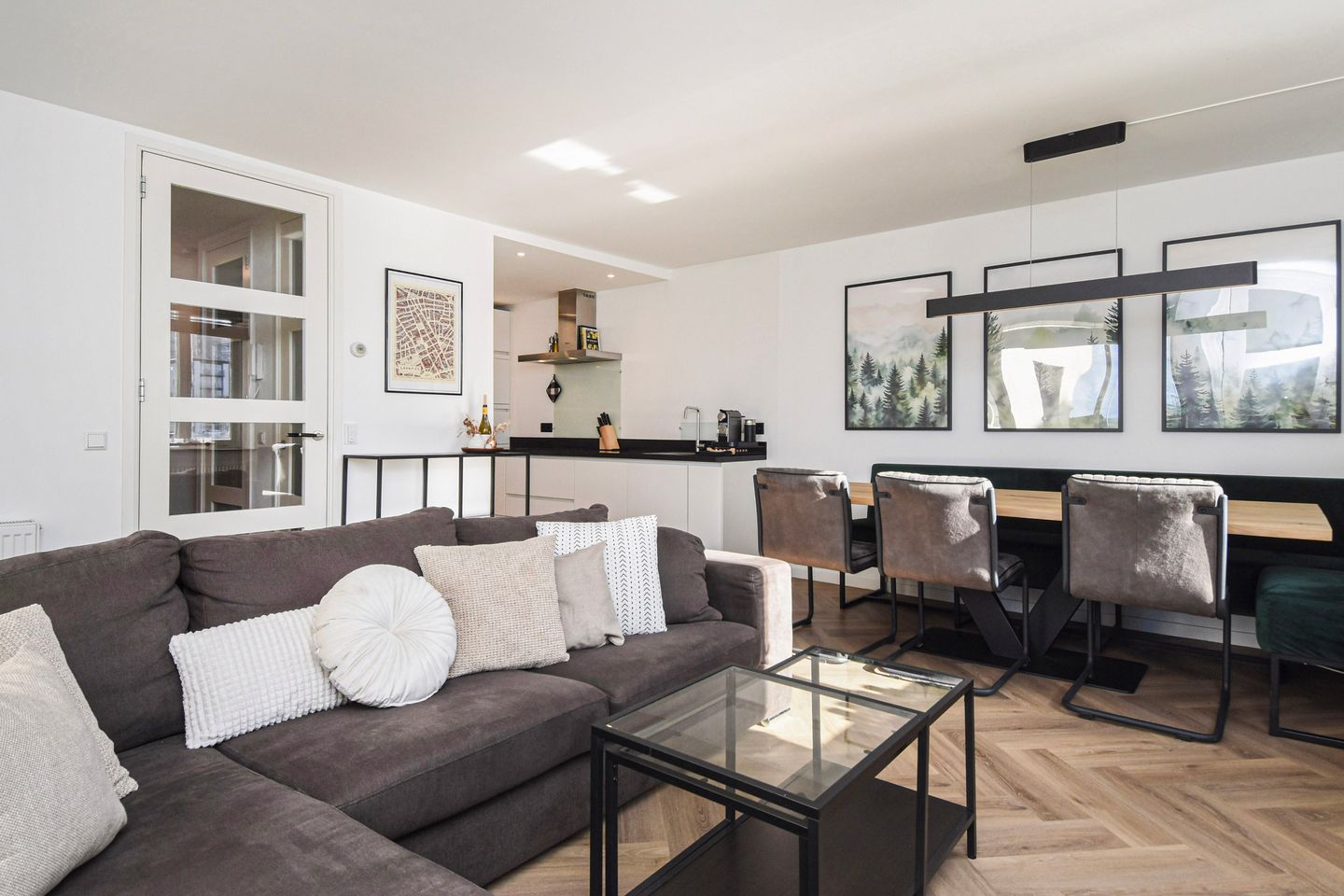 L-vormige woonkamer met voorraadkast en moderne open keuken, voorzien van diverse inbouwapparatuur.