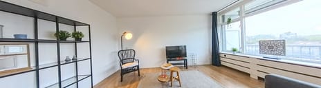 De woonkamer (voorheen twee kamers) biedt toegang tot het balkon gelegen op het westen (middag- en avondzon) en vanuit de woonkamer is er een fraai uitzicht over Den Haag.