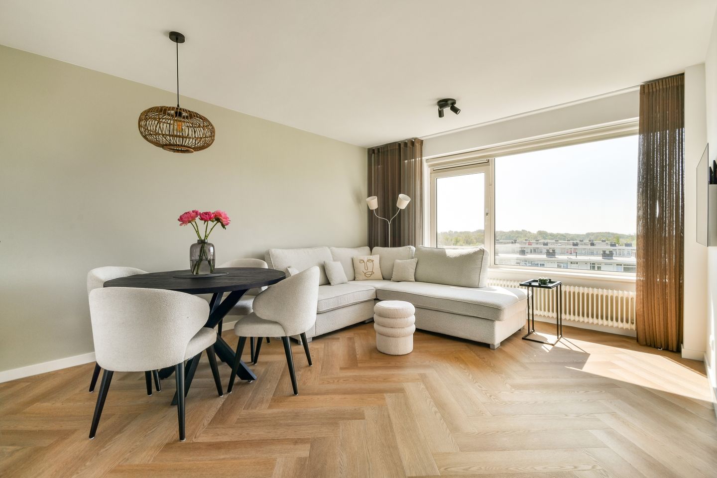 De lichte woonkamer biedt ruimte voor zowel een zit- als eethoek. Vanaf de bank kan je zelfs genieten van zeezicht! Daarnaast is er een handige inbouwkast aanwezig.