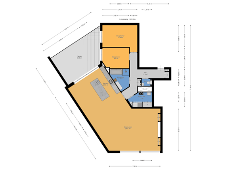 Aan de voorzijde bevindt zich het zitgedeelte met een stijlvolle, op maat gemaakte kastenwand met afsluitbare werkplek. Aan de achterzijde ligt de designkeuken met kookeiland en alle denkbare luxe inbouwapparatuur, waaronder een inductiekookplaat met geïntegreerde afzuiging, Quooker, vaatwasser, combi-oven, ruime koelkast en aparte ruime vriezer. Vanuit de keuken opent de grote schuifpui naar het riante balkon, waar u in alle rust kunt genieten van de middag- en avondzon.