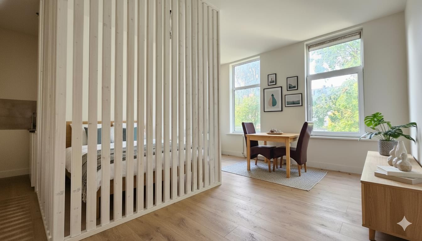 Centrale entree aan de straatzijde, trap naar de tweede etage. Vanuit de centrale hal toegang tot de woning. De woonkamer is heerlijk licht dankzij drie grote raampartijen en beschikt over een nette open keuken met inductiekookplaat, koelkast, oven en afzuigkap. Het slaapgedeelte is slim afgescheiden met een roomdivider. De badkamer is keurig afgewerkt en voorzien van douche, toilet en wastafelmeubel.