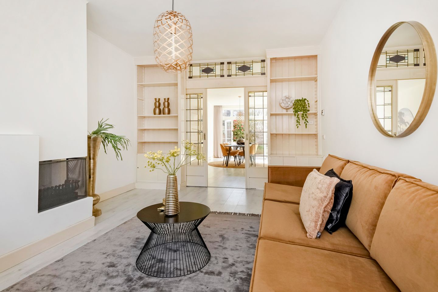De woning beschikt over een ruime woonkamer ensuite met een charmante suiteseparatie. Aan de voorzijde zorgt een open haard voor extra sfeer en warmte en heb je heerlijk vrij uitzicht over het groen. Aan de achterzijde kom je via openslaande deuren in de brede zonnige tuin gelegen op het zuidwesten – een heerlijke plek om van de zon te genieten.