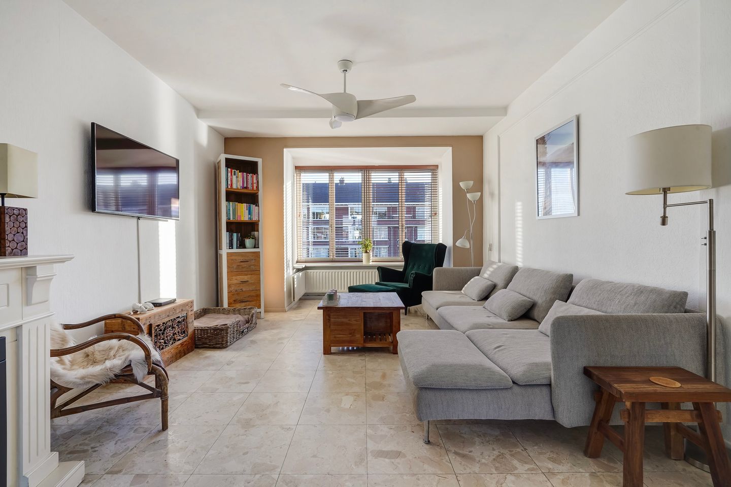 Cosy living room en-suite with sliding doors, 4 fitted wardrobes, electric fireplace and a bay window at the front with a harmonica frame over the entire width, so you can sit in the sun (facing southeast).