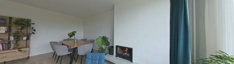 De lichte woonkamer biedt een fraai uitzicht over de bomenrij, wat zorgt voor een prettige lichtinval. De sfeervolle gashaard en de radiatorombouw versterken de warme uitstraling van de ruimte. Aan de voorzijde bevindt zich een slaapkamer met hetzelfde mooie uitzicht.