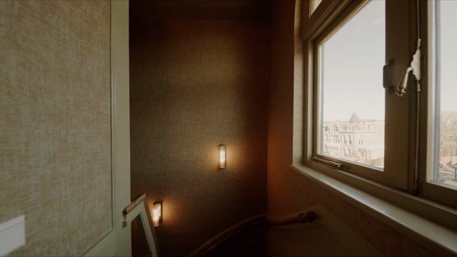 The bathroom o?ers a refined pause in the greenery: a burgundy wellness oasis with warm, brass-toned fixtures, a wooden vanity, and subtly placed shell wall lamps , the pinnacle of luxury and comfort. Finally, a floating toilet with bidet function completes this sophisticated ensemble.