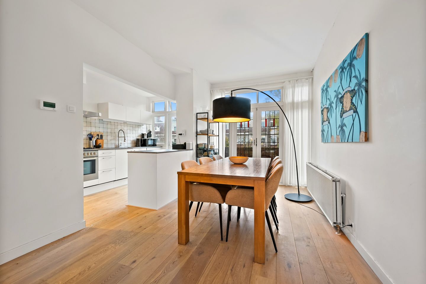 De ruime woonkamer met aangrenzende eetkamer vormt samen een lichte en prettige leefruimte met grote raampartijen en een vrij uitzicht aan de voorzijde. De open keuken is praktisch ingericht en voorzien van diverse inbouwapparatuur. Vanuit de keuken is er toegang tot het balkon over de volle breedte aan de achterzijde, een fijne plek om buiten te zitten.