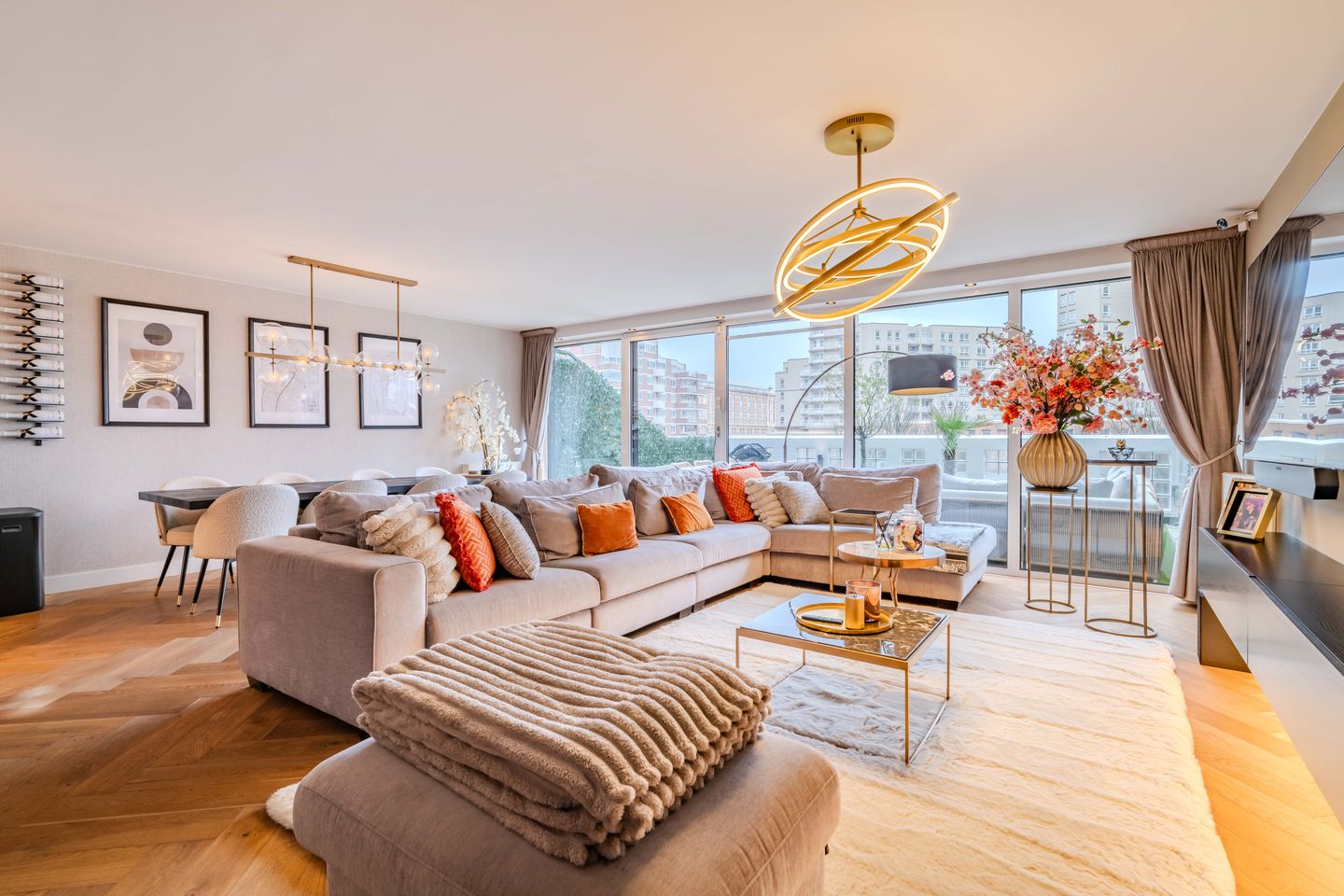Bright and spacious living/dining room with large windows and a beautiful wooden floor. The luxurious U-shaped open kitchen is equipped with a combi-oven, refrigerator, freezer, induction hob, stainless-steel extractor and dishwasher.