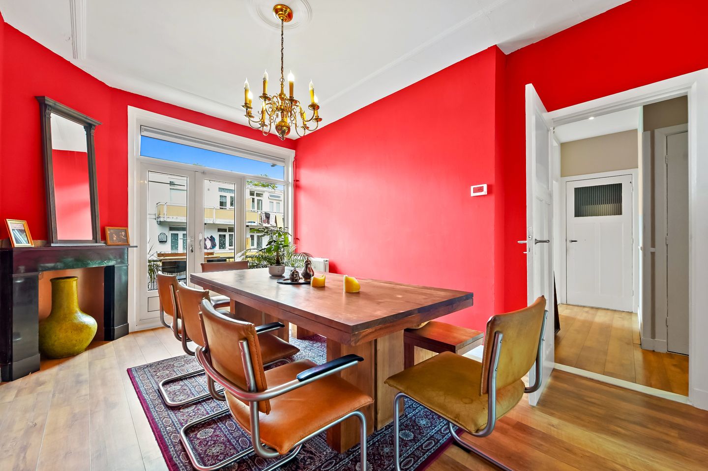 Je komt binnen via het open portiek en stapt de hal in, waar je meteen toegang hebt tot het toilet en de meterkast. Vanuit hier loop je door naar de woonkamer, een kleurrijke en sfeervolle ruimte met hoge plafonds, schuifseparatie en vaste kasten. De combinatie van een turquoise muur, klassieke details en een speelse inrichting geeft de kamer een unieke uitstraling. Aansluitend vind je de eetkamer, die dankzij de rode wanden en openslaande deuren naar het balkon echt een eyecatcher is. Hier kun je heerlijk lang tafelen met vrienden of juist rustig genieten van een ontbijt. Het balkon zelf is knus en praktisch, met een handige balkonkast voor extra opbergruimte. De keuken is modern en strak, maar door de warme tinten voelt hij toch heel huiselijk. Voorzien van alle nodige inbouwapparatuur en wederom toegang tot het balkon, waardoor je op zomerse dagen met gemak binnen en buiten combineert. De badkamer heeft een luxe uitstraling met een inloopdouche, een dubbel wastafelmeubel en stijlvolle afwerking. Een plek waar je echt even tot rust komt. Aan de voorzijde ligt de slaapkamer, die door het diepe rood en de grote ramen een intieme maar lichte sfeer heeft, perfect om je even helemaal terug te trekken.