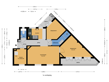 Zie de plattegrond voor de exacte maatvoering en de speelse hoekindeling.