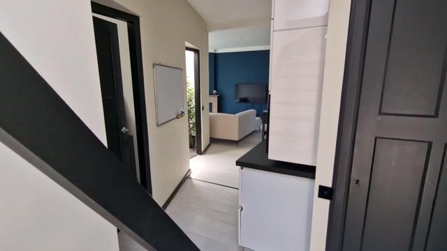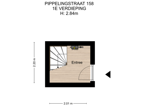 Je bereikt de woning via de open portiektrap. Op het plateau van de eerste verdieping aangekomen zijn daar twee voordeuren. De linker, die van nr. 158 geeft toegang tot een overloop waar de meterkast is en je een kinderwagen of een fiets kunt plaatsen. Van hieruit is ook de trap naar de woonverdieping. We nemen nu de trap.