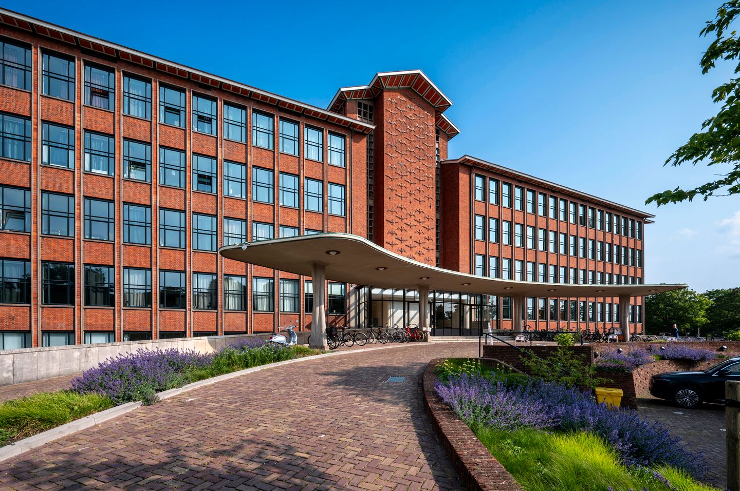The building called "De Saxofoon," which you can see from the rear, is a former government building that will soon be demolished. It will be replaced by three luxurious residential towers of equal height to the existing structure. The design of these towers will blend beautifully into the environment, offering unobstructed views from the apartment across the water "De Sprank" that flows beneath the building, all the way to the nursery and wooded area behind. This creates a uniquely serene and natural view from the apartment.