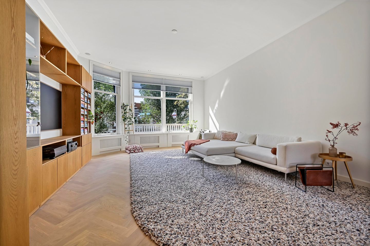 Hall with French doors to the spacious living room. At the rear is the luxurious kitchen, equipped with a cooking island with gas hob and built-in extractor system. Cupboard walls with fridge/freezer combination, large oven, and sufficient storage space. Through French doors access to the very spacious terrace located on the east with morning and early afternoon sun. For the evening sun you can go to the balcony at the front, which runs across the entire width of the house and offers a view of the chic Prins Mauritslaan.