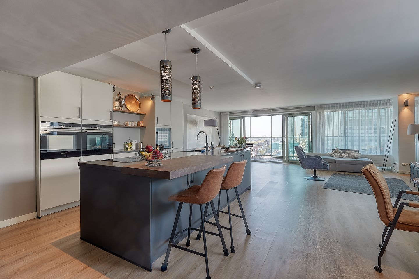 De woonkamer is licht, ruim en sfeervol ingericht en is voorzien van een verzorgde vloerafwerking. De grote raampartijen zorgen voor een aangename hoeveelheid daglicht en een prachtig, vrij uitzicht over het centrum van Den Haag. Vanuit de woonkamer is tevens toegang tot het ruime balkon, waar u in alle privacy kunt genieten van de levendige skyline en het weidse uitzicht. De open keuken sluit naadloos aan op de woonkamer en is luxe uitgevoerd met hoogwaardige inbouwapparatuur. De keuken is van alle gemakken voorzien, waaronder een koelkast, vriezer, wijnklimaatkast met twee temperatuurzones, oven en een combi-oven, inductiekookplaat met geïntegreerd Bora-afzuigsysteem, vaatwasser en Quooker. Een ideale plek voor zowel dagelijks gebruik als culinair koken en entertainen.