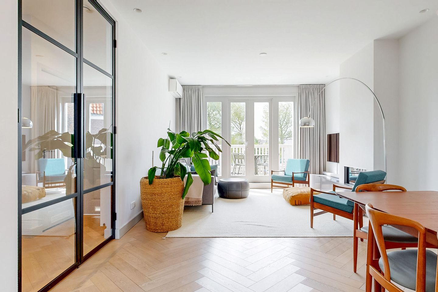 Beautiful steel double doors open to the spacious living/dining room with high-end open kitchen at the front, including a large island of no less than 3.5 meters wide and Siemens appliances including fridge/freezer, oven, microwave, dishwasher, Bora induction hob with integrated extractor, Quooker water tap and generous cupboard space. At the rear, the living room features an attractive gas fireplace and French doors to the sunny southwest-facing terrace offering unobstructed views and privacy! Luxurious WC with sink and built-in wardrobe. A sunny room with a large window faces the rear. Throughout is a beautiful oak floor laid in a herringbone pattern and the ceiling has built-in spotlights!