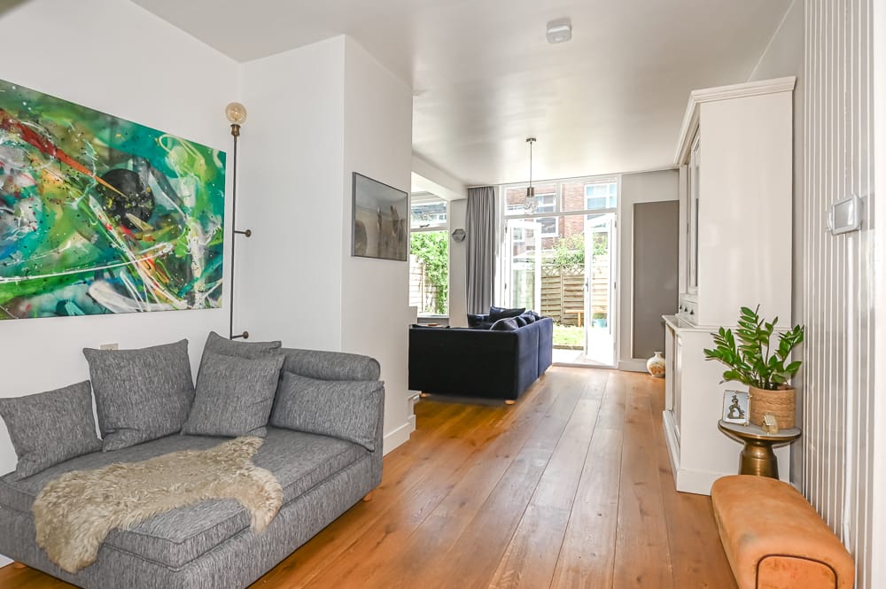 The private entrance is located on the wide sidewalk. Upon entering, you step into the hall with beautiful metro tile paneling and original terrazzo flooring with decorative trim. Vestibule door to the spacious square hall with wardrobe. Panel door with faceted glass leads to the spacious living room (almost 40m2), which occupies a central place in the house. The floor is covered with beautiful warm-colored wood flooring that continues into the kitchen. The L-shape gives the room a playful and very spacious layout. At the front, there is access to the bedroom on this floor; the other bedrooms are on the first floor. At the rear, there is a view across the full width of 7.24 m, which provides plenty of daylight and an even more spacious feel. There is access here to an extra room of approx. 5.3 m², currently used as a study. There are French doors to the lovely sunny charming backyard. The opening to the kitchen is wide. The modern kitchen is L-shaped and has all the expected appliances. As a pleasant and spacious bonus, the kitchen has an extension that is used as a spacious utility room with access to a spacious storage room (together approx. 10.5 m²). The aforementioned hall has access to the (second) bathroom with a shower and toilet.