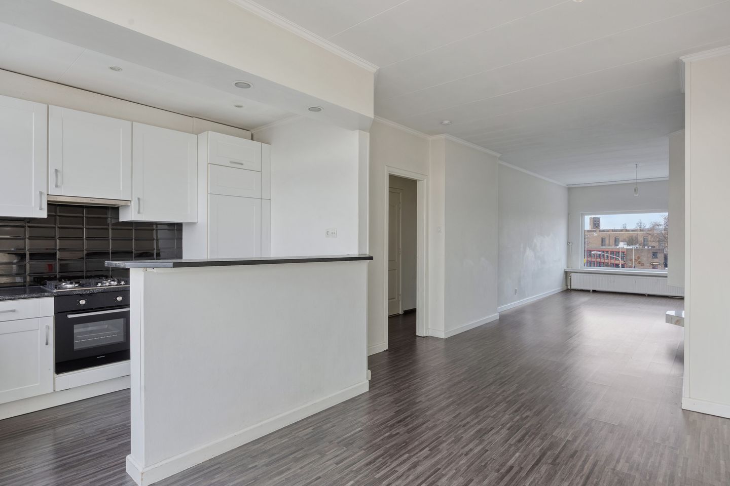 Ruime woonkamer met open keuken. Aan de voorkant van de woonkamer bevindt zich een gashaard. De aan de achterkant gelegen keuken is van alle benodigde inbouwapparatuur voorzien. Het ruime balkon bevindt zich over de gehele breedte van het appartement en is gelegen op zuid-oost waardoor de zon er een groot deel van de dag te vinden is.