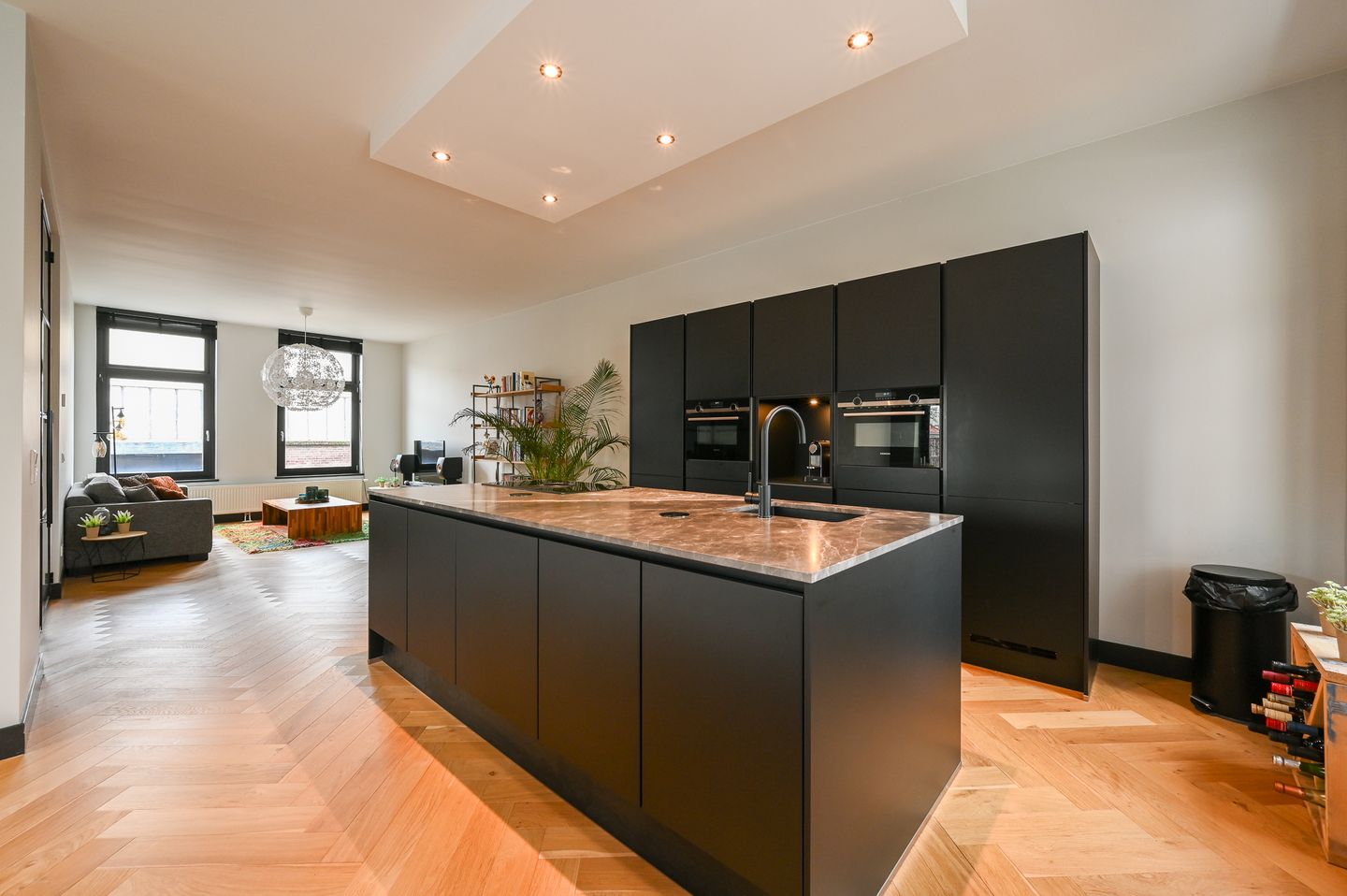 De keuken is het middelpunt van het appartement met een riant kookeiland met een BORA inductiekookplaat met geïntegreerde afzuiging, spoelbak en vaatwasser. Een strakke kastenwand met een handige nis voor een koffiecorner, 2x combi-oven en een koel-/vriescombinatie.
