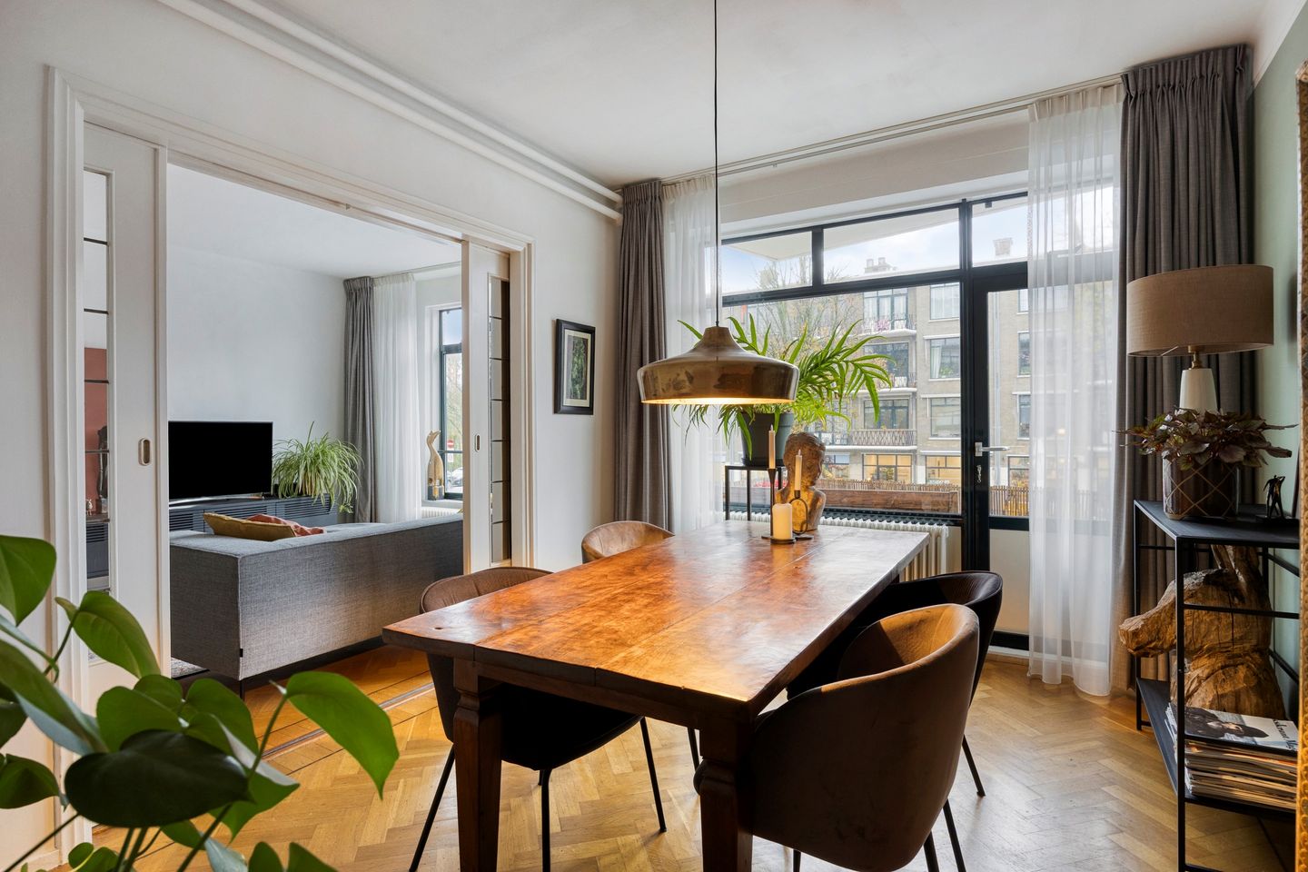 De lichte woonkamer en suite beschikt over grote raampartijen die zorgen voor een prettige lichtinval. De originele glas-in-lood schuifdeuren verbinden de woonkamer met de eetkamer en de slaapkamer en geven het geheel een karakteristieke uitstraling.