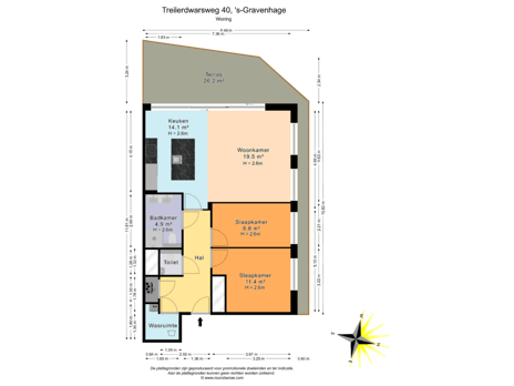 - 26 m² (3,24 meter diep en 7,36 meter breed)