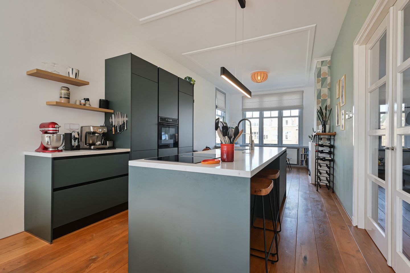 Hier kom je uit in een royale, centrale hal met een fraaie lichtkoepel die zorgt voor veel lichtinval. Vanuit deze hal zijn alle vertrekken toegankelijk. In de hal zijn twee praktische vaste kasten, waarvan één met opstelplaats voor de cv-ketel en de wasmachine. De doorgebroken woon- en eetkamer is een echte eyecatcher: ruim, sfeervol en heerlijk licht dankzij de zijramen en de hoekligging. Authentieke details zoals de schouw en lijstplafonds geven de ruimte karakter, terwijl je geniet van een vrij uitzicht over de Valkenboskade. De luxe open keuken met kook- en spoeleiland sluit naadloos aan op de eetkamer en is voorzien van diverse inbouwapparatuur, een inductiekookplaat en volop bergruimte. Vanuit de eetkamer stap je zo het zonnige balkon op het zuidwesten op. Aan de achterzijde bevinden zich twee slaapkamers, waarvan één met vaste kast en directe toegang tot een ruim en zonnig terras. De derde slaapkamer ligt aan de voorzijde. De nette badkamer is voorzien van glas in lood bovenlichten, een inloopdouche, een ligbad en een dubbele wastafel. Er is een separaat modern toilet met fonteintje.