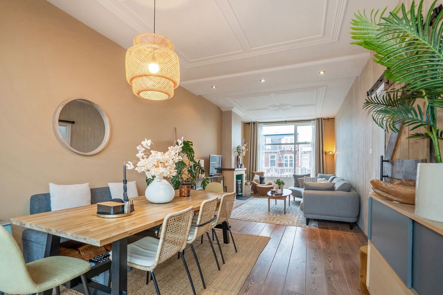 De woon-/eetkamer is zonder twijfel het kloppend hart van de woning: opvallend breed, heerlijk licht en met een prachtige open indeling dankzij de voormalige en-suite. Aan de voorzijde bevindt zich de gezellige zithoek met sfeervolle houtkachel en een deur naar het balkon op het oosten – een heerlijke plek voor de eerste koffie in de ochtendzon.