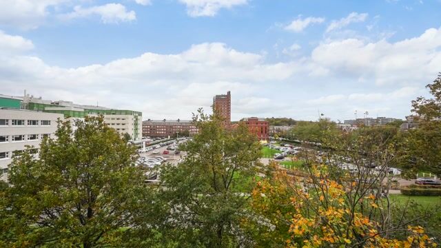 Located in the striking apartment complex "Groenendaal 2" on the third top floor, this exceptionally spacious apartment (approx. 134 m²) features a bright living/dining room, three bedrooms, two bathrooms, a separate kitchen, two sunny southwest-facing balconies, and a storage unit in the basement.
