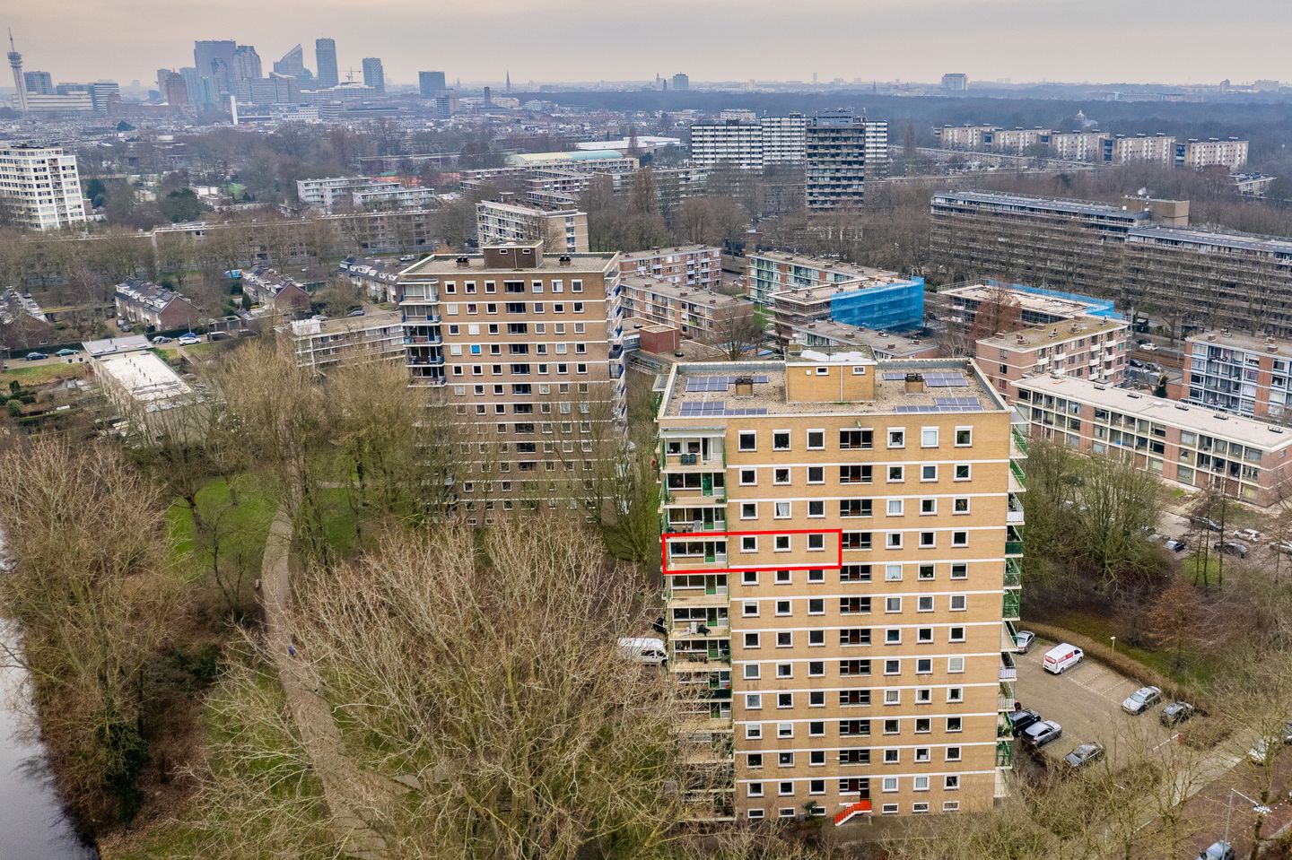 Parking on enclosed grounds. Neatly maintained porch with mailboxes and doorbells. Stairs or elevator to the 8th floor. Indoor entrance to the apartment. Hallway with access to all rooms, in order of entry: Indoor storage room annex laundry room. Spacious modern bathroom with walk-in-shower, washbasin with storage furniture and radiator. Separate toilet room in the same color scheme as the bathroom, equipped with hand basin. Two bedrooms, both with a nice view of trees. Spacious and, partly due to the corner location, bright living room with access to the first balcony. The living room has a built-in cupboard. Closed and spacious kitchen with all desirable built-in appliances, namely: induction hob, dishwasher, fridge-freezer, oven and stainless steel extractor hood. The kitchen is also equipped with a built-in closet and provides access to the second balcony.