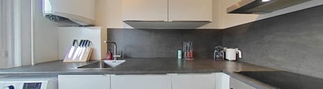 Moderne keuken in hoekopstelling (ca. 2.95 x 2.31m) met onder- en bovenkasten, 4 pits inductiekookplaat, oven, afzuigkap, koelkast, vriezer, vaatwasser.