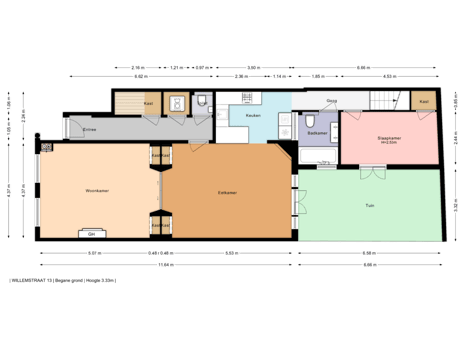 Eigen entree op straatniveau, ruime hal met toilet, kast met wasmachine, deur naar woonkamer met riant zitgedeelte en open haard aan de voorzijde. Via fraaie schuifdeuren in de suite separatie bereikt men de eetkamer met open haard aan de achterzijde. Vrijwel de gehele achterzijde beschikt over raampartijen waardoor een zeer gunstige lichtinval ontstaat. Openslaande deuren naar de tuin. De open keuken beschikt over hardstenen werkblad, 5-pits gasfornuis met brede oven, rvs afzuigkap en vaatwasser.