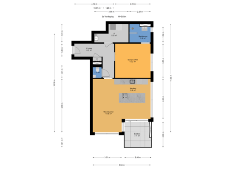 - 7 m² (2,80 meter diep en 2,66 meter breed)