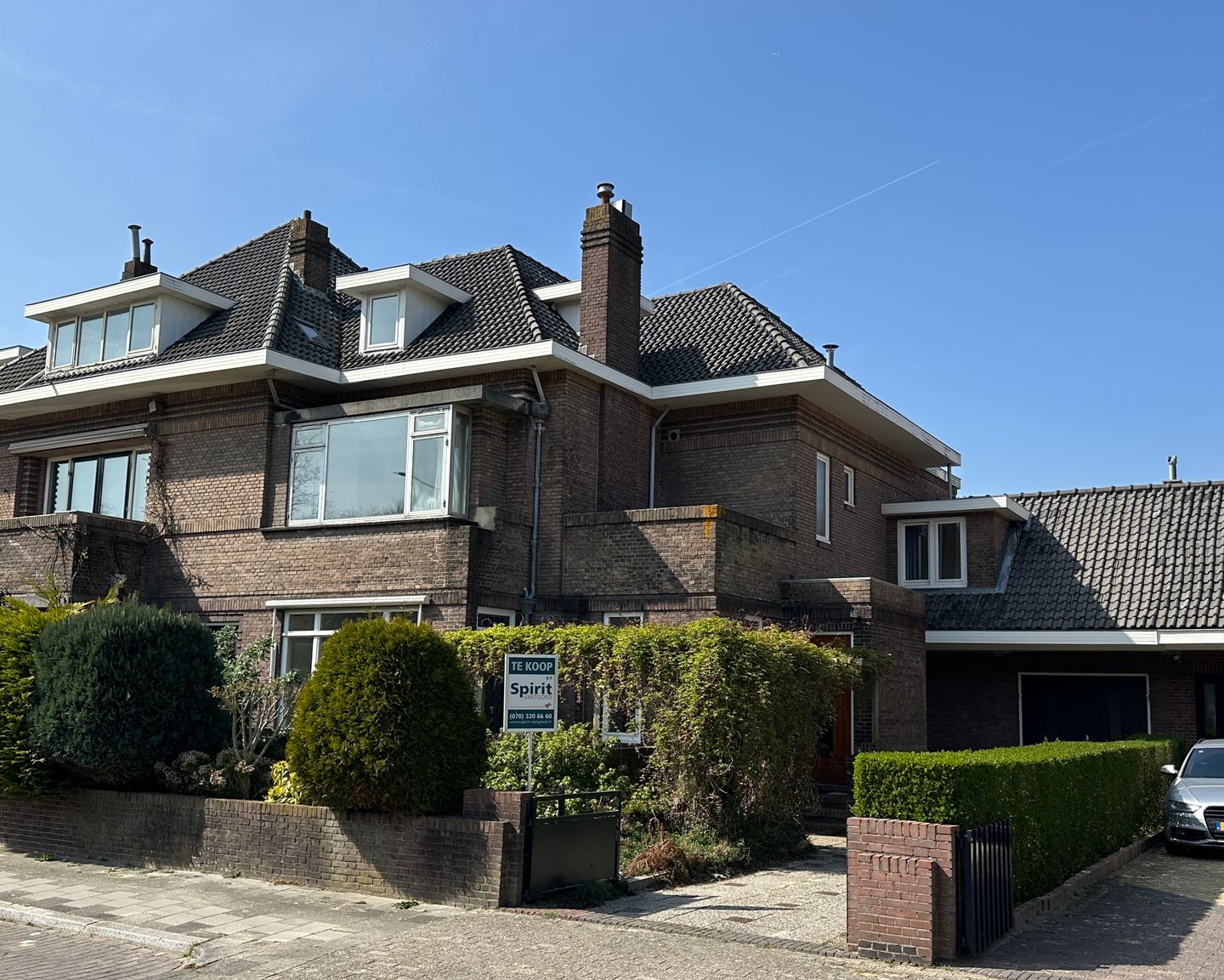 De voor deze bouwperiode zo kenmerkende elementen zijn direct zichtbaar: grote overstekken, mooie daklijnen, een balkon en dakkapellen.