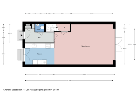 - 56 m² (10,55 meter diep en 5,35 meter breed)