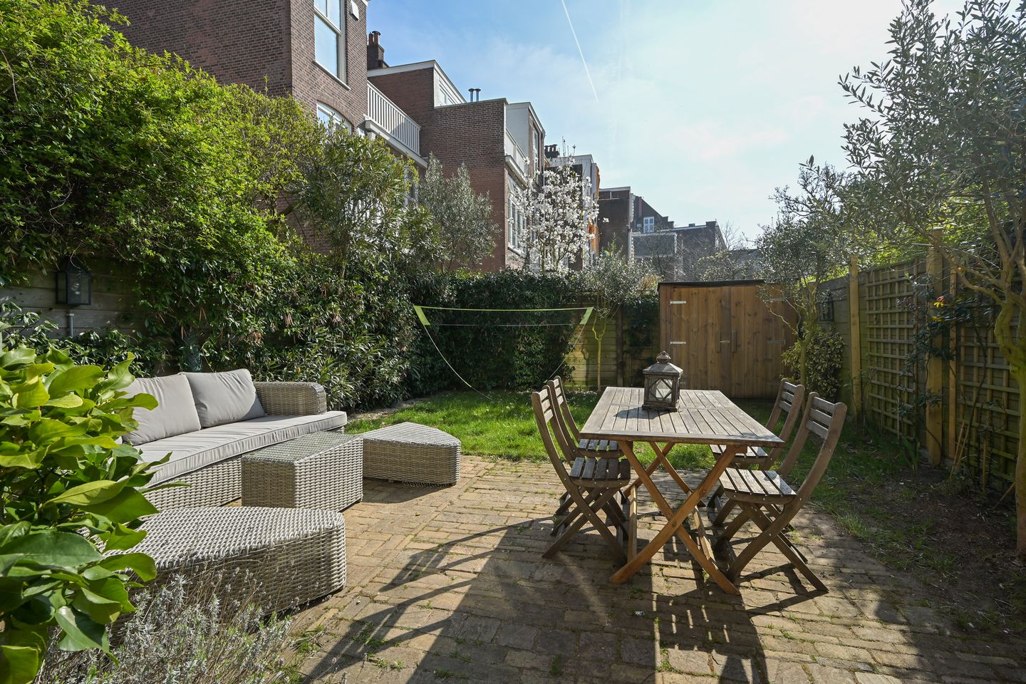 Beautifully laid out back garden with freeviews. The back garden is equipped with lovely garden lighting, an outdoor tap and at the rear a wooden chalet (with electricity both inside and outside). Sun from early morning to late afternoon.