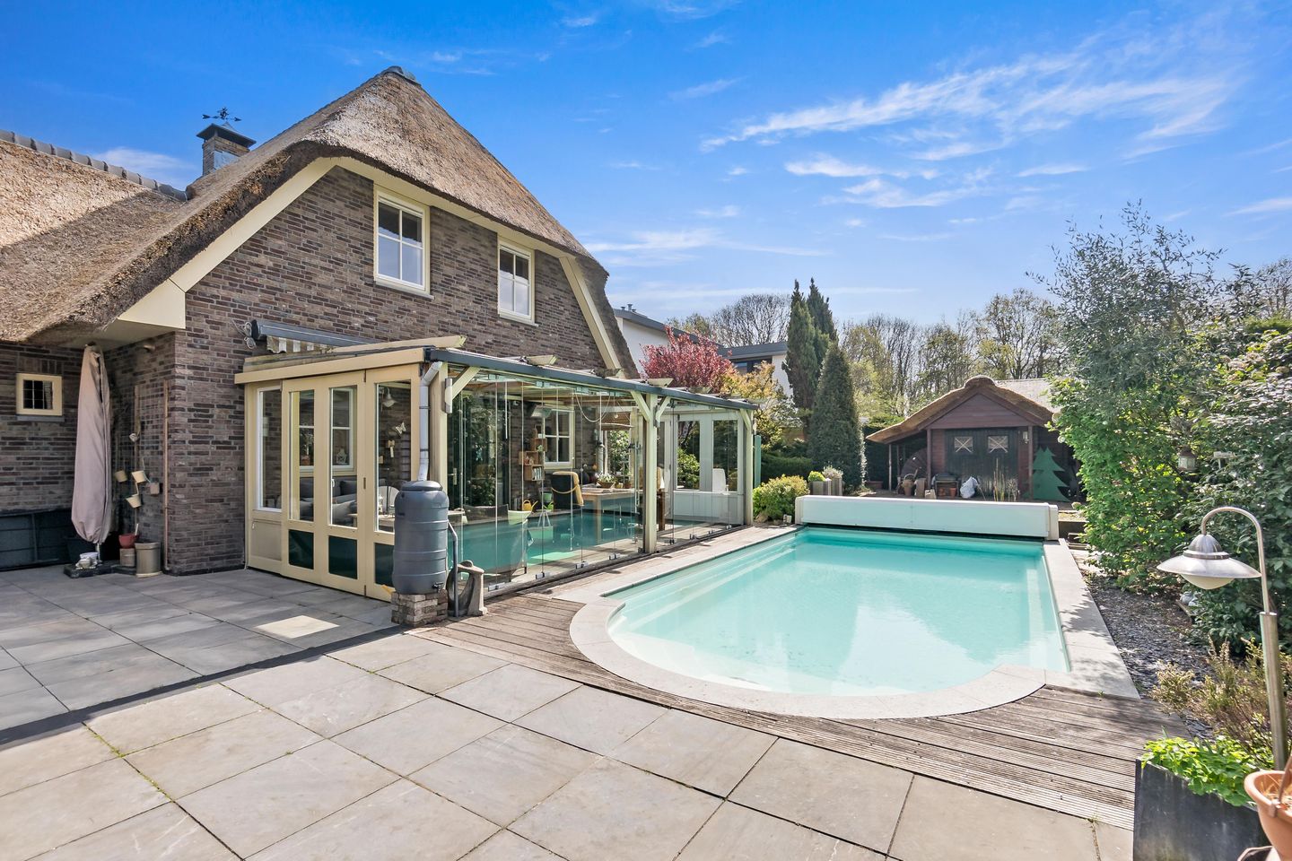 Naast de hoofdruimten beschikt de woning over een verwarmd buitenzwembad met buitendouche, een schuur in de tuin voorzien van rieten kap en een eigen sauna met geluidsinstallatie voor ultieme ontspanning.