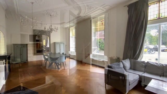 U komt binnen in de ruime entreehal met originele marmeren vloertegels en garderoberuimte. Separaat toilet met fonteintje. De lichte, royale woonkamer op de hoek heeft een sfeervol plafond met ornamenten, glas-in-loodramen en een visgraat parketvloer. Aan de achterzijde bevindt zich de halfopen keuken, uitgevoerd in massief hout met een granieten werkblad, luxe inbouwapparatuur en een spoeleiland met Quooker, vaatwasser en dubbele Amerikaanse koelkast. Via openslaande deuren stapt u zo de fraai aangelegde, stadstuin in.