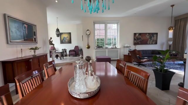 The L-shaped living room boasts a ceiling height of 3.10 meters. A bay window with a raised platform adds charm and extra space, while double French doors open to the garden. South- and west-facing windows feature sun-reflective roller blinds, and 15 recessed ceiling lights provide ambience. The grand French-style gas fireplace adds elegance.
