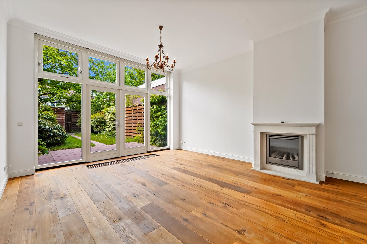 Overloop met houten vloer, tweede moderne badkamer met douche, hangend toilet en wastafel. Grote slaapkamer aan de achterzijde met houten vloer en openslaande deuren naar het terras. Grote slaapkamer aan de voorzijde, ook met houten vloer.