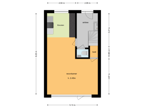 - 43 m² (8,20 meter diep en 5,30 meter breed)