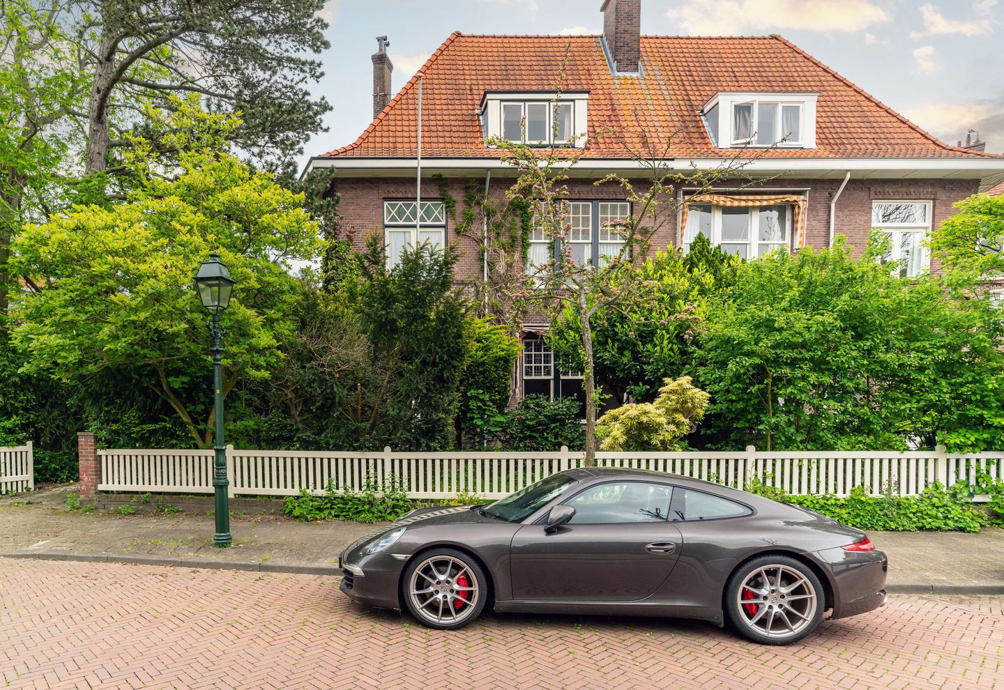 The villa features a charming, low-maintenance, and sunny front garden, a back garden, and a driveway/parking area with parking space for multiple cars. Additionally, there is a detached garage and multiple storage rooms providing ample space for bicycles, garden tools, and other necessities.