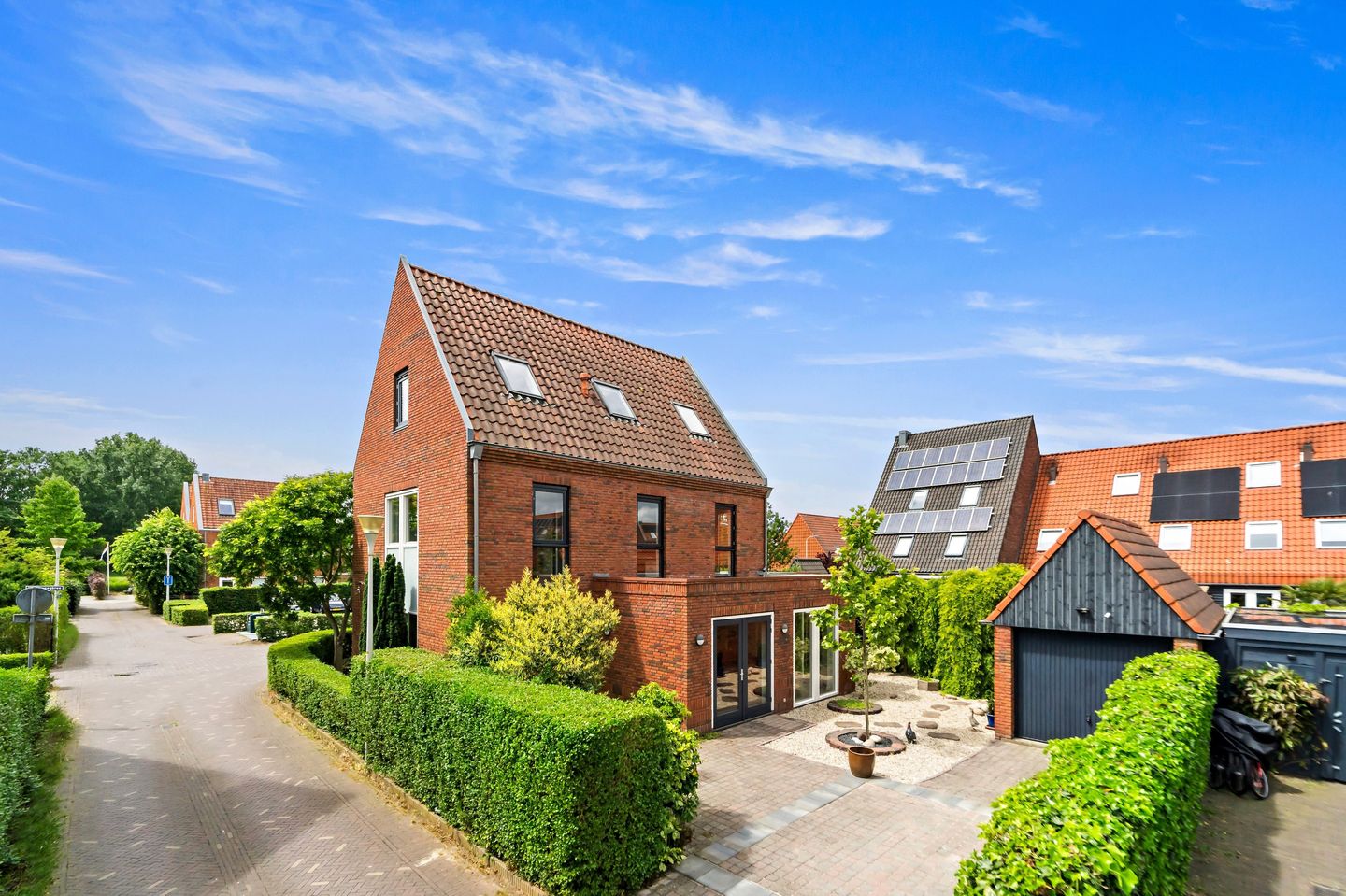 Via de verzorgde voortuin komt u binnen in de zeer ruime hal, waar zich het toilet met fontein bevindt en toegangen tot de royale, lichte woonkamer en de werkkamer. De comfortabele werkkamer is ideaal voor thuiswerken, kantoor/praktijk aan huis of als speel- of eetkamer. Gebruik als zesde slaapkamer is ook een optie. Dankzij de grote raampartijen en openslaande deuren naar de tuin verbindt u binnen met buiten. De open woonkeuken is voorzien van AEG- en Siemens-inbouwapparatuur, waaronder een inductiekookplaat, afzuigkap, koelkast, vaatwasser, oven en magnetron. Vanuit de keuken, woonkamer én werkkamer is er directe toegang tot de zij- en achtertuin. Aan de achterkant van de woning ligt de oprit naar de vrijstaande en betegelde garage, voorzien van een handige vliering: perfect voor extra opslagruimte. Rondom het huis zorgen bomen, heggen en struiken voor de nodige privacy. De zijtuin aan de waterkant heeft een aantal stenen treden die toegang geven tot de waterrand die met stapelbare stenen is verfraaid.