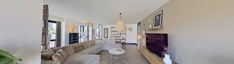 Laten we beginnen in de woonkamer. Deze is zeer royaal en biedt door de raampartijen aan alle zijden heerlijk licht.