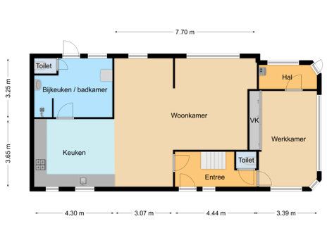 Via de keuken heeft u toegang tot de bijkeuken annex badkamer. Deze ruimte heeft een inloopdouche, een wasbak, een toilet en een verhoogde opstelplaats voor de wasmachine en droger.