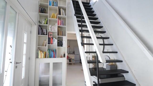 Indeling: ruime entree met ruimtelijk zicht naar de vide, toilet met fonteintje, deur naar de beneden werkkamer(of slaapkamer) in de serre met meterkast en een vaste kastenwand.