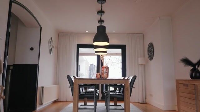 Charming | De charmante woonkamer valt meteen op door het royale formaat, de hoge raampartijen met het prachtige lichtinval en strakke afwerking. De pelletkachel vormt het sfeervolle middelpunt en maakt van deze leefruimte een plek waar je je met gemak uren terugtrekt. De eethoek grenst aan de woonkamer, met openslaande deuren naar de veranda. De keuken is strak uitgevoerd, met greeploze fronten en hoogglans wit voor een moderne look. Praktisch detail: vanuit de keuken heb je toegang tot de kelder en het washok.
