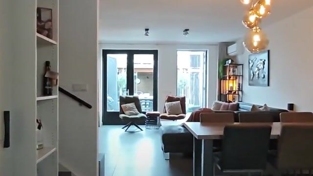 In de woonkamer bevind zich de open trapopgang naar de eerste verdieping, voorzien van trapverlichting, een ingebouwde kast en een praktische trapkast met schappen. Voor een aangename temperatuur is in de woonkamer een LG airconditioning geplaatst.