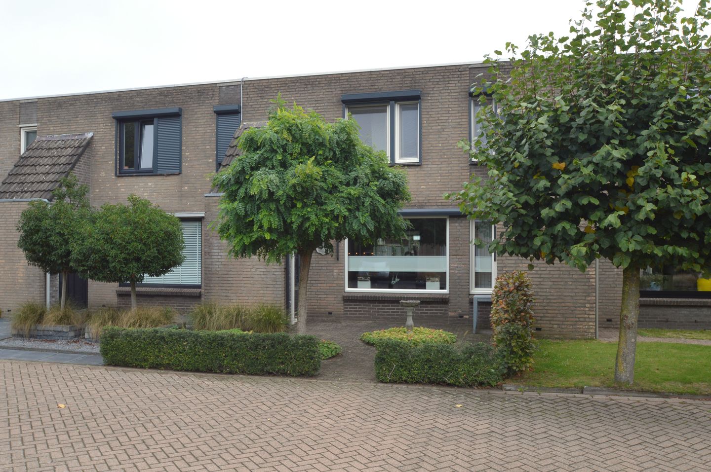 De voortuin is verzorgd aangelegd met hagen, borders met beplanting en bestrating, wat samen een nette en uitnodigende entree vormt.