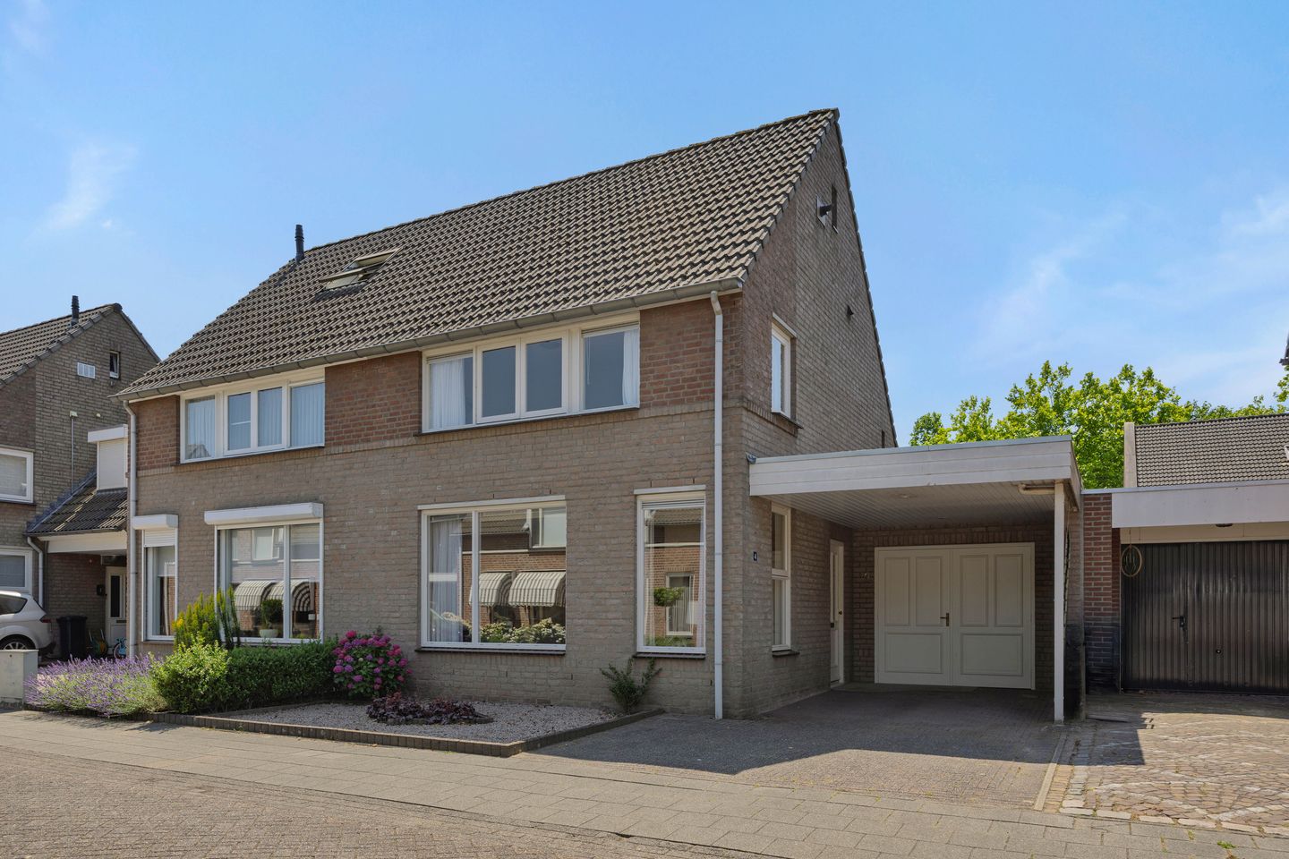De voortuin is opgebouwd uit vaste beplanting met aan de rechterkant een verharde oprit met carport. Vanaf de oprit kun je naar binnen door de voor- of achterdeur.