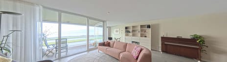 De woonkamer heeft een oppervlak van 63 m2 en is helemaal op de IJssel gericht. Grote ramen over de hele breedte van de kamer bieden een prachtig panorama. Via de brede schuifpui loop je het balkon op waar je een flink deel van het jaar beschut buiten kunt zitten. Een elektrisch zonnescherm zorgt voor de gewenste schaduw.