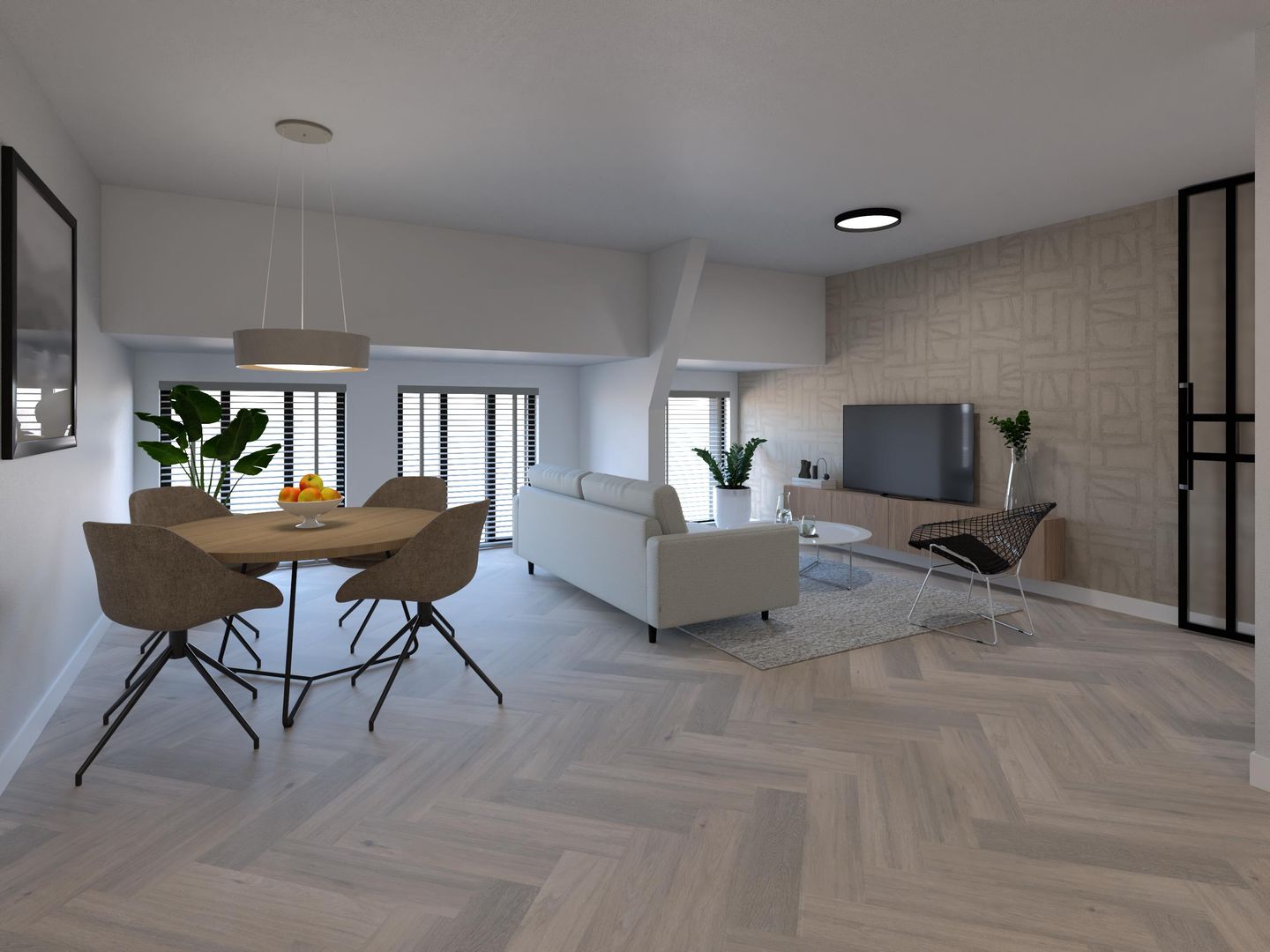 De sfeer is modern, luxe en warm. De keuken is open en uitgevoerd in een stijlvolle taupe-zwarte kleurstelling, met volledig geïntegreerde inbouwapparatuur: een inductiekookplaat, combi-oven, vaatwasser, koel-vriescombinatie en een afzuigkap. De keuken staat in open verbinding met de woonkamer en vormt samen één comfortabele en sfeervolle leefruimte. Een verdiepingshoge stalen deur tussen gang en woonkamer voegt een modern, industrieel accent toe. De slaapkamer ligt rustig en voelt ruimtelijk aan. De badkamer is een plek om tot rust te komen, met grootformaat beige betonlook tegels, matzwarte inbouwkranen en een verlichte spiegel. Zelfs de toiletruimte is met zorg vormgegeven, met een matzwarte kraan op een witte fontein en een strak wandcloset.